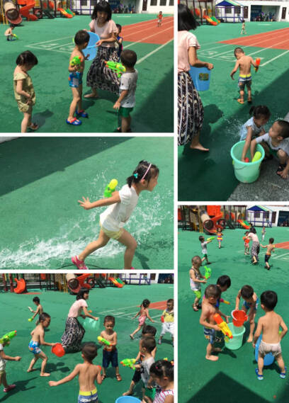 隨著老師的一聲令下,活動開始。孩子們在歡聲笑語中你打我一槍,我打你一槍,你追我,我追你,玩得可起勁了!一時間,操場上熱鬧非凡,飛濺的水花,爽朗的笑聲、加油聲、吶喊聲像一個個美妙的音符在迪斯尼幼兒園上空翩翩起舞。