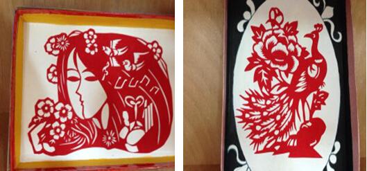這兩幅是中二班李春紅老師用刀刻出來的美麗孔雀錦花圖和淡妝少女圖。