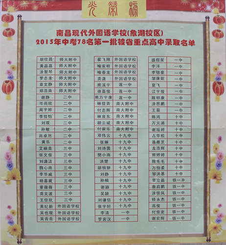 今年,在現外象湖校區擴班背后離不開好口碑的支撐,2015年,象湖校區中考創造輝煌,500分以上的考生達到100人,3人成績超過600分,78人被省第一批重點高中錄取,其中,6人錄取師大附中,8人錄取南昌二中。正是因為象湖校區這些令人興奮的成績吸引了學生家長的慕名前來,才有今年擴班形勢喜人的成果。