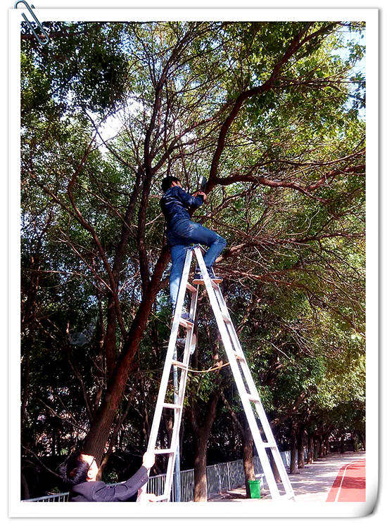 張主任站在梯子上鋸樹