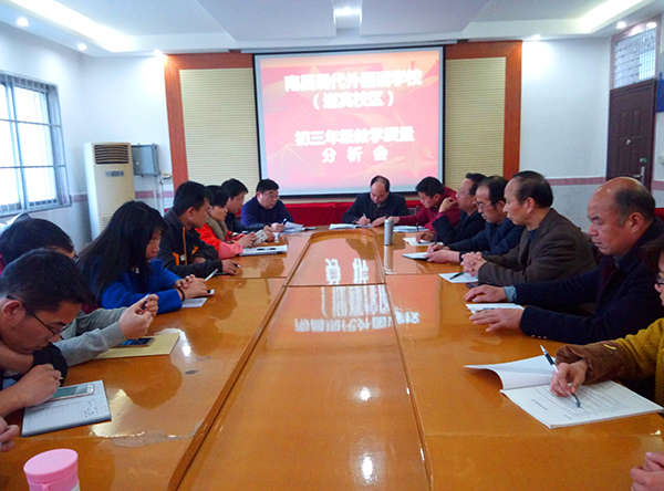 首先初三年級組組長張曉軍老師在會上發言,他就本屆初三學生的生源質量及本次考試成績作了通報。接著初中部教務主任楊小龍說,為能在今年中考中有較好成績,各科老師要齊心協力,磨尖治拐,既要重視培養基礎知識和基本技能,又要讓學生“跳起來摘梨子”。