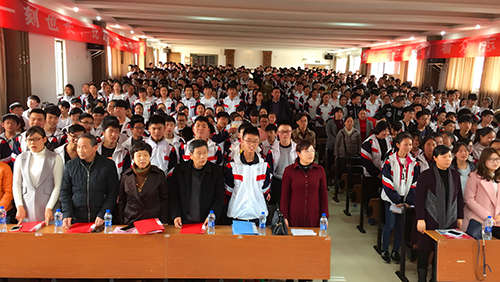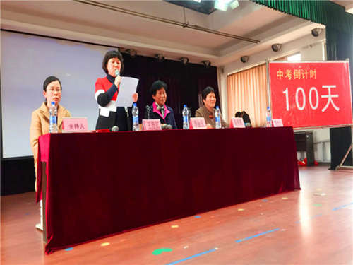 會議在雄壯激昂的國歌聲后,李金玉校長、陳勇鋒副校長作為校領導代表在全體師生的共同見證下,拉開了百日沖刺的倒計時牌匾,那醒目的“100天”字樣燦爛生光,照進了每一個師生的心間。會上,李金玉校長作了動員報告,她講到,中考的路上不單單是知識的較量,更重要的是心態的較量,還有毅力、耐力、意志品質的考驗。每個同學都要有鍥而不舍、孜孜以求、拼搏奮斗的精神,要有贏的強烈欲望。并希望全體教師以最佳的備課方案、優質的課堂教學、真摯的感情與學生們同舟共濟,做好最堅強的后盾。請同學們把父母的聲聲叮嚀,師長們的殷切期盼化著動力。用100天給自己一個機會,用100天為自己創造一個奇跡,用100天送給關愛你的人一個“驚喜”。讓我們挑戰2017年的中考,再創學校的輝煌!