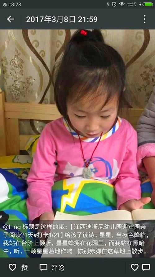 考慮到不同年齡段孩子的不同發(fā)展需求,幼兒園還細致周到的分別為小、中、大班的孩子選定了不同的打卡主題。大班為親子閱讀,中班為我是家庭好幫手,小班為好習(xí)慣培養(yǎng)。