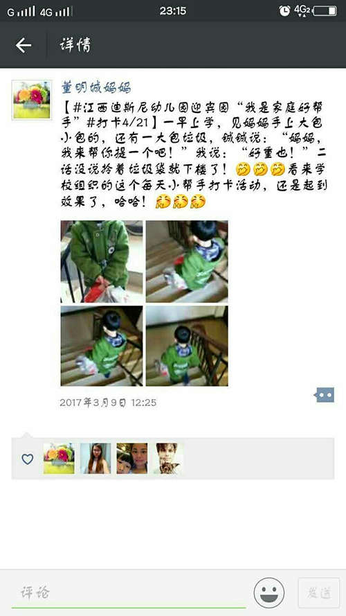 活動一推出,立即獲得了家長們的支持,家長們紛紛積極參與,將與孩子的互動記錄在朋友圈,并發(fā)在班級群內(nèi)與家長們共同交流。此外,幼兒園還為家長們準備了獎狀,既感謝家長們對幼兒園工作的支持,也感謝家長們?yōu)楹⒆映砷L的付出。