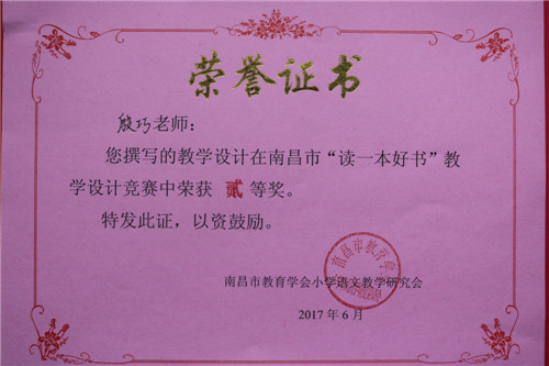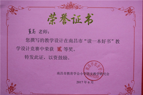 南昌外國語學校(象湖校區)積極組織教師參加活動。教師非常重視,專心讀書,精心備課,用心設計。通過層層評選,學校教師楊芳撰寫的《讀一本好書》--《魯濱孫漂流記》教學設計,邵露老師撰寫的《隙中窺月,感悟真情》--《夏洛的網》教學設計,榮獲南昌市“讀一本好書”教學設計競賽壹等獎的好成績,殷巧、周麗、董茜、張孌四位老師分別榮獲貳等獎。
