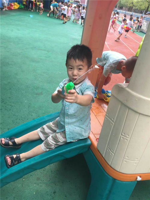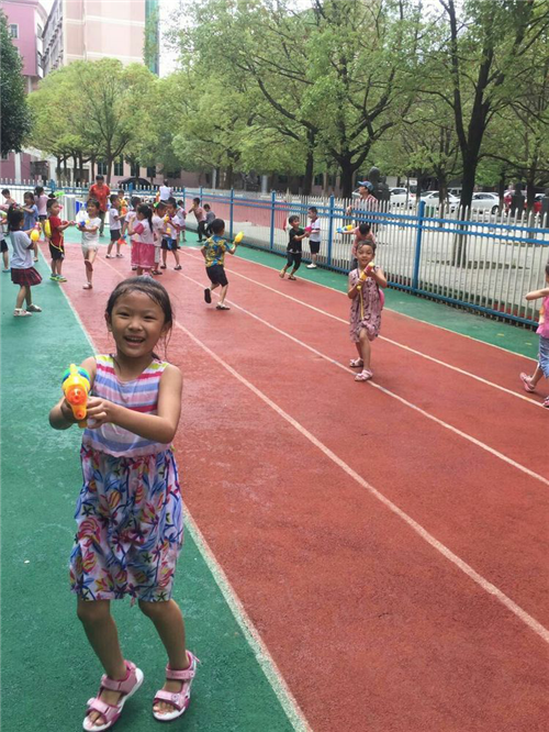 活動(dòng)中,每個(gè)孩子做了充分準(zhǔn)備,有雨衣、雨靴、備用衣物,最吸引眼球的還屬威力不同的水槍裝備,有大小不同的水槍、各種卡通造型的水槍、“噴霧器式”水槍等。在活動(dòng)中,有的班級(jí)的孩子打起了“保衛(wèi)戰(zhàn)”,“開戰(zhàn)!”老師一聲令下,孩子們互相噴射起來(lái),個(gè)個(gè)都神勇無(wú)比,不甘示弱。孩子們充分體驗(yàn)了玩水槍的快樂,此時(shí),幼兒園變成了歡樂的海洋。在水槍大戰(zhàn)中老師加入到孩子們的隊(duì)伍中,像做戰(zhàn)指揮官一樣率領(lǐng)著小朋友們盡情地開展玩水游戲,尖叫聲、歡笑聲、吶喊聲,此起彼伏,幼兒園頓時(shí)沸騰起來(lái),變成了一片歡樂的海洋。