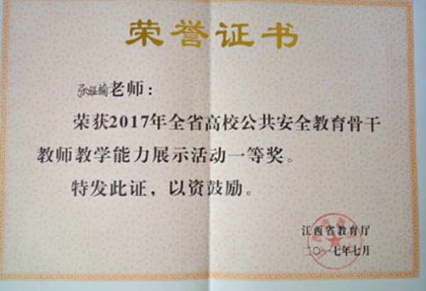 秋季開學前夕,從省教育廳傳來喜訊,省教育廳文件“關于2017年全省高校公共安全教育骨干教師教學能力展示活動結果的通報”(贛教穩定字[2017]15號) 列出了參加這次活動的獲獎名單 ,全省共有83所高校參加比賽,江西工商職業技術學院張婭楠老師榮獲全省高校專科組一等獎。