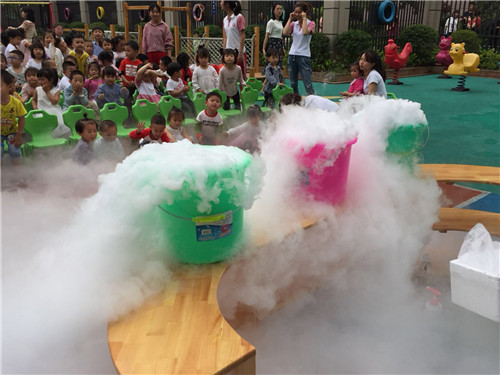 本次活動的主題是《干冰的奧秘》和《神奇的煙霧大炮》。活動開始通過一個小游戲來闡述二氧化碳的制作物——干冰的神奇效果。老師先往三個透明瓶子里裝滿了綠,籃,橙三種顏色的色素水,隨后加入了一些干冰,水馬上冒起了白煙。為了讓孩子們感受大氣壓力,老師分別用“大頭吹風(fēng)機(jī)”和“神奇的煙霧炮彈”等游戲,讓孩子感知?dú)鈮阂约皻鈮号c體積的關(guān)系。