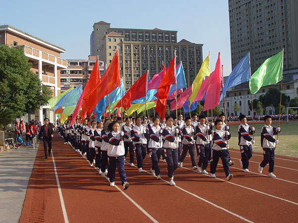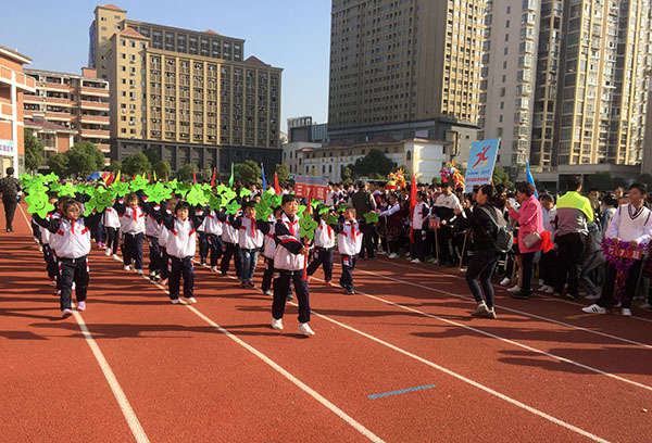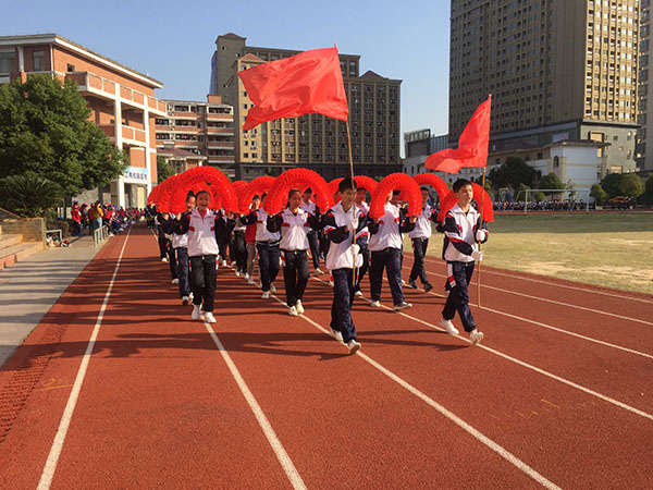 比賽結束后,李金玉校長致辭。他代表學校對運動會的順利舉行表示熱烈祝賀,對為大會的召開而辛勤工作、精心準備、做出貢獻的老師、同學表示誠摯的謝意。同時也向本次大會的裁判員、教練員、運動員表示崇高的敬意!李校長從習總書記的體育強國夢講起,希望同學們通過運動會,從體育活動中感知體育的魅力,強健體魄,將青春與活力在賽場上釋放,也希望開展陽光體育活動,能讓學生牢固樹立終身鍛煉的體育健康理念,走進陽光,走進操場,走進自然,實現“每天鍛煉一小時,健康工作五十年,幸福生活一輩子”的美好愿望,奏響生命的最強音。最后,李校長從四個方面,對全校師生、運動員提出了相關要求。運動員代表胡雅瓊、裁判員代表糜霞依次在國旗下莊嚴宣誓。