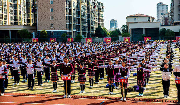 在激昂的《運動員進行曲》音樂聲中,隆重而熱烈的開幕儀式拉開帷幕。青春的腳步,快如金秋之風;綻放的笑容,燦若春曉之花。國旗隊、會徽隊、彩旗隊、鼓號隊首先入場,場面壯觀,氣勢恢宏。在儀仗隊的引領下,70個班運動員方陣昂首步入會場,嘹亮的口號彰顯出同學們飽滿的狀態和高昂的斗志。新穎出彩的口號標語、創意十足的才藝展示、精致巧思的造型道具……無不透露著現外學子意氣風發、昂揚向上的良好精神風貌。接著,進行3—8年級學生廣播體操比賽,隨著悠揚的音樂響起,同學們神采飛揚,一雙雙小手在空中劃出優美的弧度,一張張笑臉洋溢著濃濃的青春活力,展現了學生陽光可愛,健康向上的精神面貌。