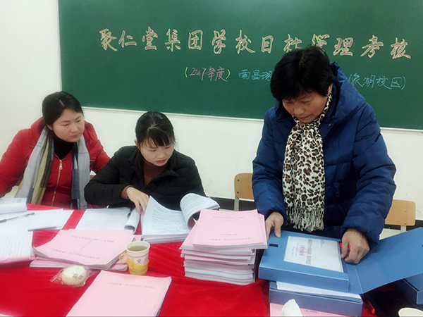 2018年1月4日上午,我們聚仁堂集團董事長助理詹攀攀帶領集團經營管理目標考評組,來到南昌現代外國語學校(象湖校區),進行2017年度目標管理考核評估。考評組按照聽、問、查、看、最后反饋的程序,對2017年年度工作目標制定;年度學校、部門工作計劃、總結;周工作計劃、總結;員工培訓等14項工作進行了細致全面的檢查。