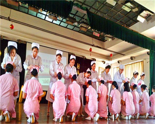 在授帽儀式結束后,由護士生進行了匯報演出。其中17級護理1班合唱改編版的歌曲《愛的供養》,歌詞贊美了護士不畏艱險、甘于奉獻、救死扶傷、勇于獻身的人道主義精神;17護理4班的小品《幫我練練手》以幽默風趣的口吻講述了實習護士日常工作的點滴,以及人們對護理工作的理解和支持。