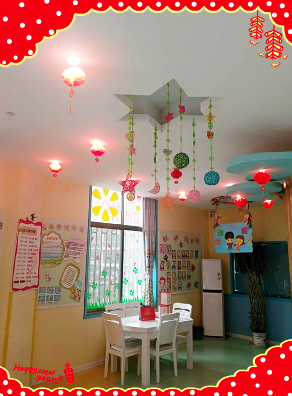 空氣中彌漫著濃濃的新年氣息,瞧,老師們正在門口掛燈籠呢。幼兒園的白熾燈下面掛滿了紅彤彤的小燈籠,很是奪人眼球,讓人心曠神怡,整個幼兒園在張燈結彩映襯下,處處洋溢著新春佳節的喜慶。