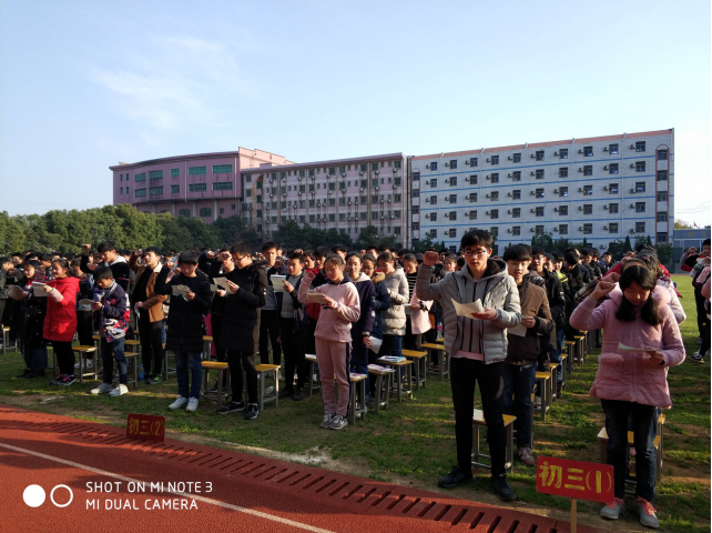 最后,在李明月同學的帶領下,全體師生宣誓——“苦磨九年,終成一劍;……我自信,我出色;我拼搏,我成功”。