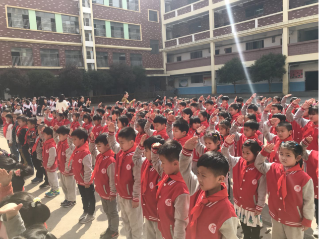 儀式上,歌聲嘹亮,隊旗、紅領巾格外鮮艷,五年級的老隊員為123名新隊員佩戴了紅領巾。隨后,輔導員帶領新隊員在隊旗下莊嚴宣誓,并為同學們送上了寄語:“戴上紅領巾,就增添了一份自豪,也多了一份責任。你們要從小做起,一點一滴積累,成為一個好思想、好品德的少先隊員!”在鮮艷的隊旗下,新隊員們高舉右手,一起跟著大隊輔導員莊嚴宣誓,那稚嫩的童聲,回蕩在現外象湖上空,宣告一個嶄新的童年已經吹響號角……