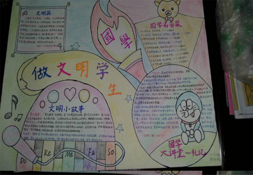 通過這期手抄報的制作,學(xué)生們在選材、制作、欣賞的過程中再次受到了國學(xué)古訓(xùn)的熏陶,開拓了視野、陶冶了情操,也讓學(xué)生再一次感悟到國學(xué)經(jīng)典的魅力之處,同時也讓學(xué)生真正參與到學(xué)經(jīng)典、用經(jīng)典的實踐中去。
