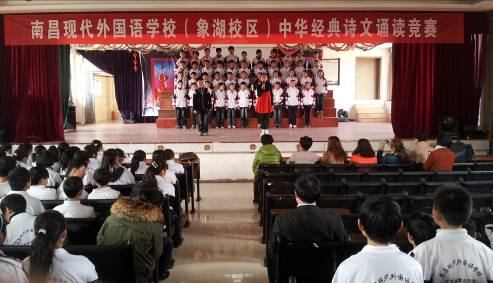 2013年1月29日下午,南昌現(xiàn)代外國(guó)語(yǔ)學(xué)校(象湖校區(qū))在演藝廳舉行了中華經(jīng)典詩(shī)誦讀比賽。全新的誦讀形式,訓(xùn)練有素的朗誦水平,精美的舞臺(tái)設(shè)計(jì),獨(dú)特的節(jié)目編排讓全校師生共享了一場(chǎng)視聽的饕餮盛宴。比賽朗誦的詩(shī)題材廣泛,既有中華經(jīng)典的,也有現(xiàn)代的;既有歷代文豪的,也有領(lǐng)袖人物的。參賽選手所誦讀的中華經(jīng)典詩(shī)文縱貫古今,氣勢(shì)磅礴,集中抒發(fā)了對(duì)祖國(guó)、對(duì)中華文化的熱愛之情,對(duì)如今生活的珍惜和贊頌之情。