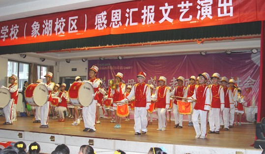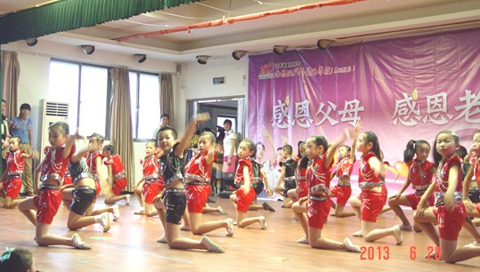 此次文藝演出圍繞“感恩”主題,頌揚了父母、老師及社會對孩子的培養之情,同學們以豐富多彩的文藝節目展現了校園生活,反映了他們的快樂和感恩之情。舞臺背景上醒目的標識:“感恩父母、感恩老師、感恩社會”及2個敬禮的少先隊員的畫面,構建了會場濃濃的感恩氛圍。開場時嘹亮的鼓號聲奏響了孩子們的前進誓言,拉開了表演的序幕。隨后,精彩的節目一一登場,《大家一起來》、《印度天使》是小學一、二年級小朋友們帶來的節目,他們年紀雖小,但舞蹈水平不低,整齊劃一的動作、天真無邪的笑容,不禁讓人心生憐愛;《英語歌曲串燒》、《中華武術魂》、《戲曲聯唱》不僅給大家帶來驚喜,也從不同的側面反映出了校園文化生活的豐富多彩。令人忍俊不禁的是三(1)班的《江南style》,胖胖的“鳥叔”一上場,臺上臺下都響起了一片歡呼聲,將演出推向了高潮!